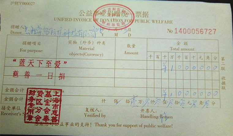 眾幸股份的下屬公司上海尊島防護(hù)科技有限公司響應(yīng)四團(tuán)鎮(zhèn)人民政府的號(hào)召,積極參與公益事業(yè),為第二十二屆“藍(lán)天下的至愛”慈善活動(dòng)添磚加瓦,貢獻(xiàn)自己的綿薄之力。